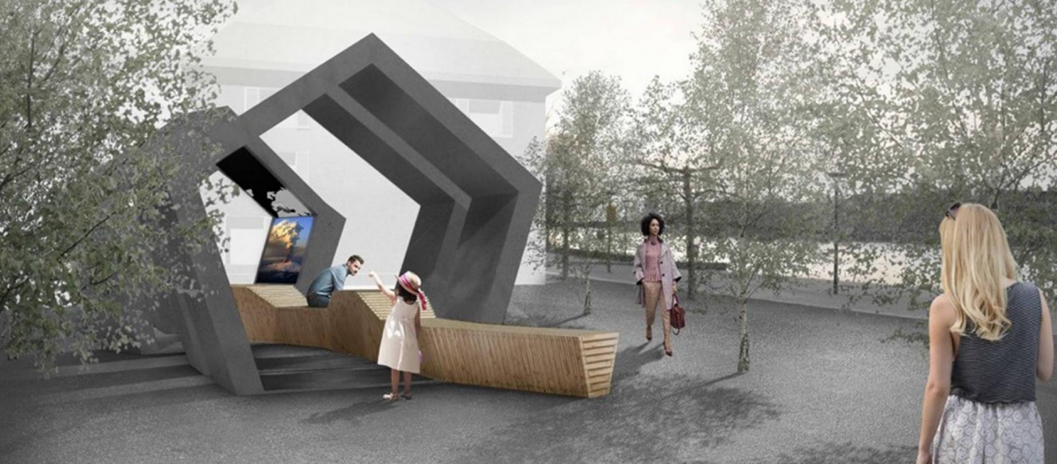 The pentagons are positioned so that the space between them is demonstrably open. They include flatscreens and interactive elements visualizing different current topics and content from the university and the HTWG’s portfolios. “We wanted to create a place that fits in well with its surroundings and invites passersby to explore it”, says the “5x5” team. Visitors can rest on the bench and take in the surrounding nature, city life or panoramic view, (depending on the current location), while also having the opportunity to dive into the world of science and research. Whether they take a quick glance or plumb the depths, visitors decide for themselves.