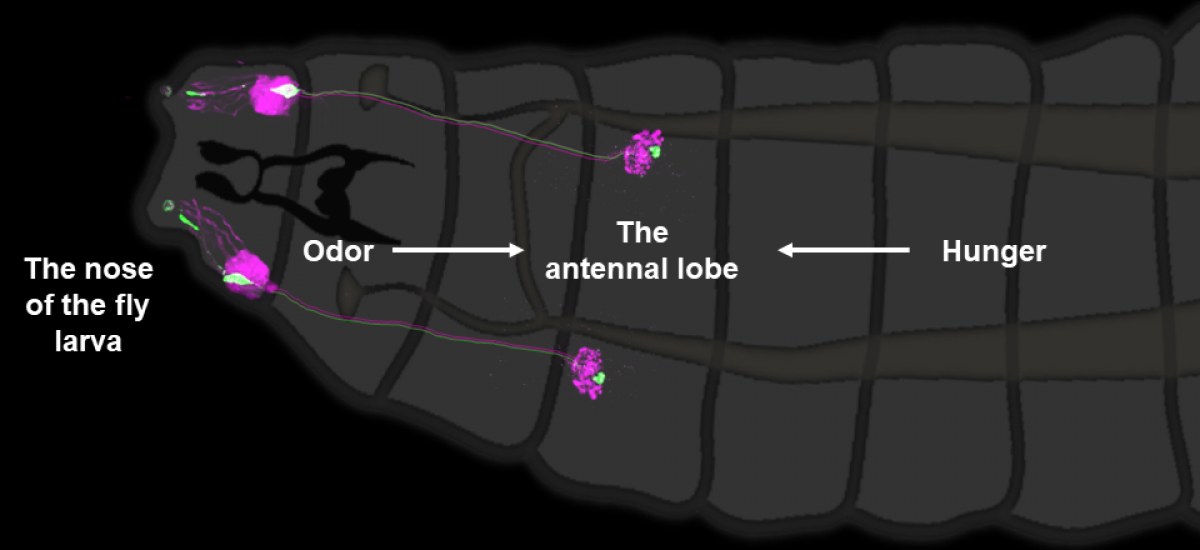 In the framework of her most recent study, which has just appeared in the journal Science Advances and originates from her time as a post-doctoral researcher at Harvard, Katrin Vogt and her colleagues have examined how hunger influences the behaviour of vinegar flies and what exactly happens in the animals’ brains in the process. The idea for this came to her while looking at the “wiring diagram” of the vinegar fly’s brain. “Looking at the connectivity pattern of the nerve cells in the first olfactory centre of the fly larva, known as the antennal lobe, we presumed that there must be at least two different states of activity in the olfactory system. We wanted to know what causes the transition between these two states of activity and arrived at hunger as a possibility,” explains Katrin Vogt. As it turned out, she and her fellow researchers evidently had a good nose.