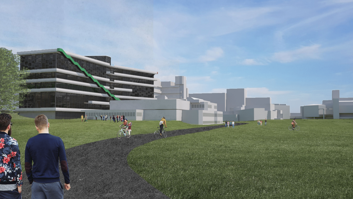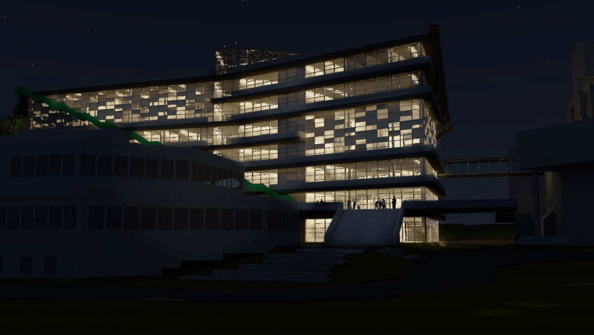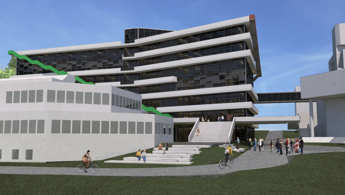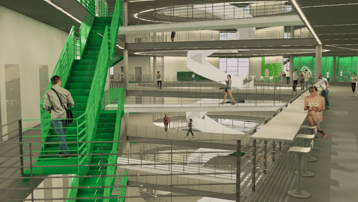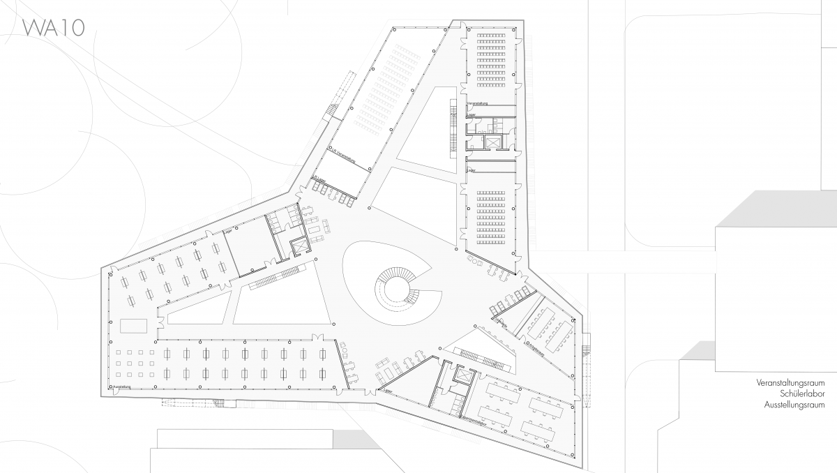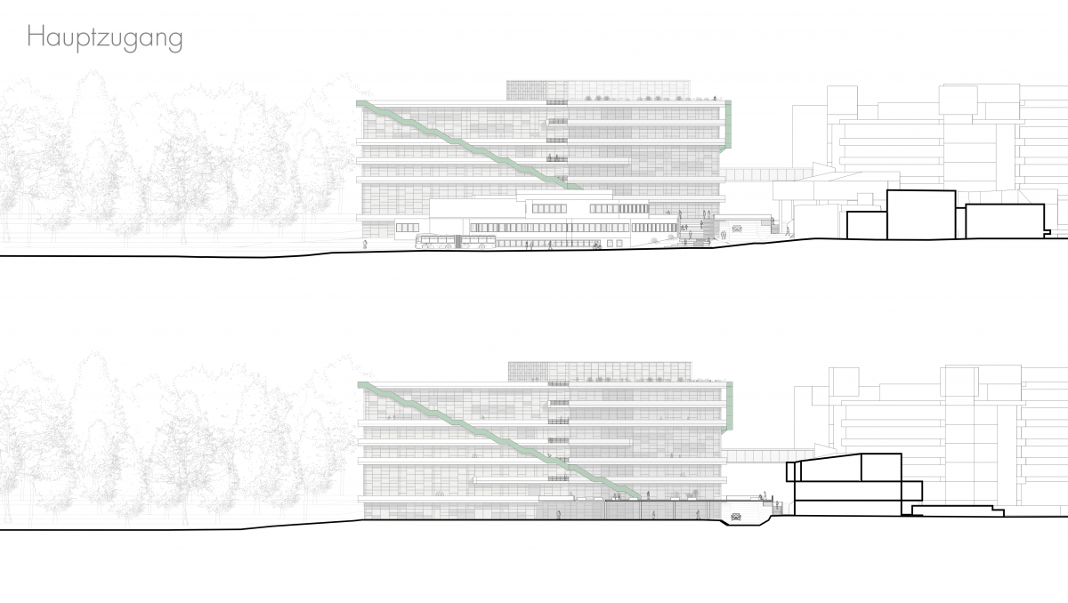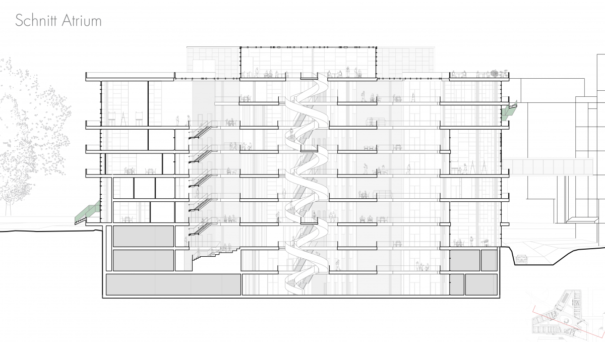 Der Entwurf von Isabel Ohorn, Eduard Schmidt und Calliope Trouillet greift das Bild eines biologischen Organismus auf und gestaltet das Forum Konstanz als einen lebendigen Kreislauf des gegenseitigen Austausches, als ein Nervensystem der zirkulierenden Informationen. Drei Gebäudeflügel verschmelzen organisch miteinander, ihren Knotenpunkt erfüllt ein großes, luftiges Atrium als Ort der Begegnung. Eine Treppenspirale, die an einen DNA-Strang erinnert, zieht sich im Mittelpunkt durch alle Etagen und verbindet offene Begegnungsräume mit Nutzungseinheiten. Der Entwurf legt ein besonderes Augenmerk auf die Einbindung des Forums in das Wege- und Verkehrsnetz – sozusagen das „Nervensystem“ – der Universität sowie auf die Anbindung des bestehenden Werkstattgebäudes W. Der Außenbereich ist durch eine markante Treppe gestaltet, die in Sitzstufen auf einer Grünfläche als Aufenthaltsbereich ausläuft.