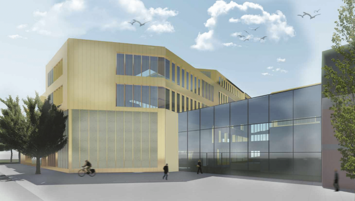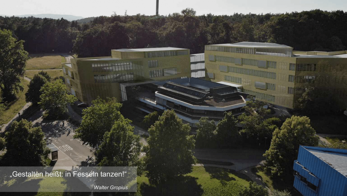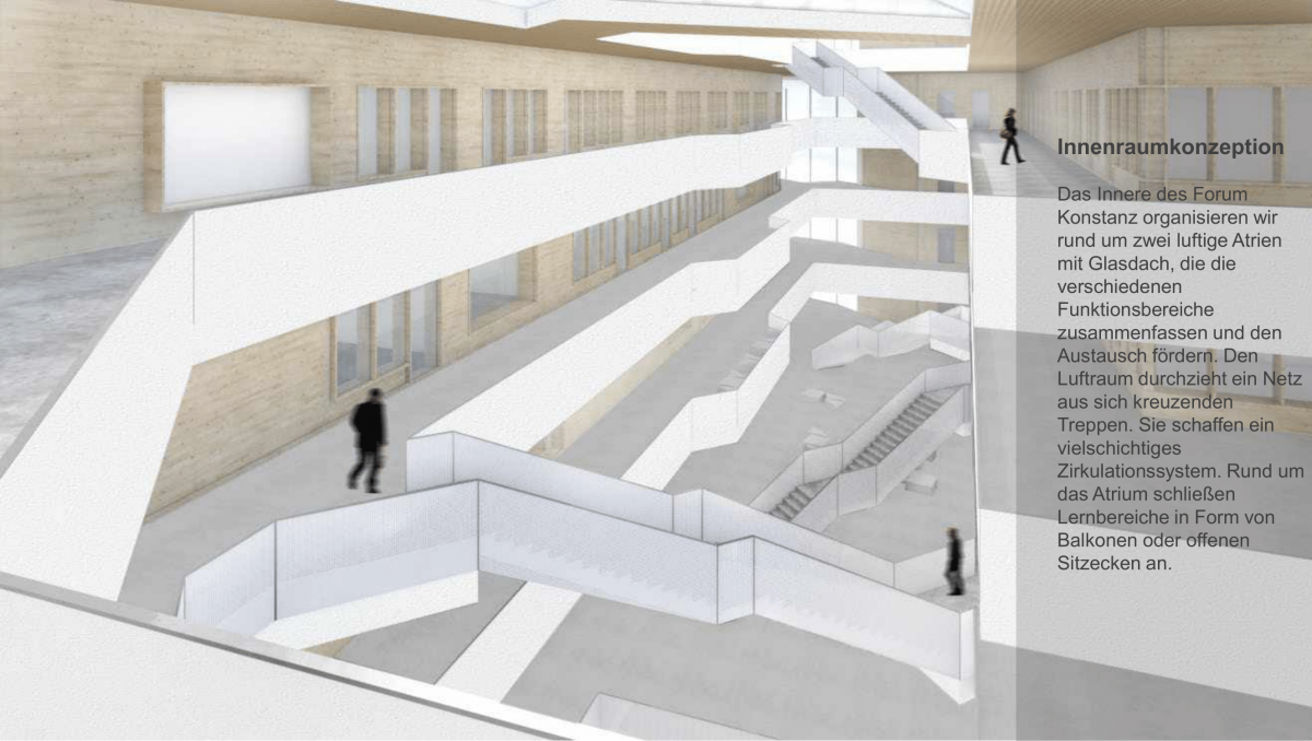 Ina Janetschek und Ronja Schumacher greifen in ihrem Entwurf die bestehende Formsprache der universitären Architektur auf und führen sie weiter, so dass sich das Forumsgebäude nahtlos in das Gesamtbild der Universität Konstanz eingliedert. Die Grundstrukturen des Gebäudes bauen sich sukzessive in Form von versetzten Ebenen auf, wodurch der Bau trotz seiner Größe verspielt und nicht massig wirkt. Der Innenbereich wird von zwei luftigen Atrien mit sich kreuzenden Treppen geprägt, große Fenster im Inneren ermöglichen von dort aus Einblicke in Forschungsbereiche und weitere Räumlichkeiten. Der Entwurf integriert das bestehende Werkstattgebäude W in das Forum Konstanz und schafft ein gemeinsames Wegenetz. Eine matte, goldbraune Außenfassade aus Kupfer und Aluminium repräsentiert das Gebäude nach außen.