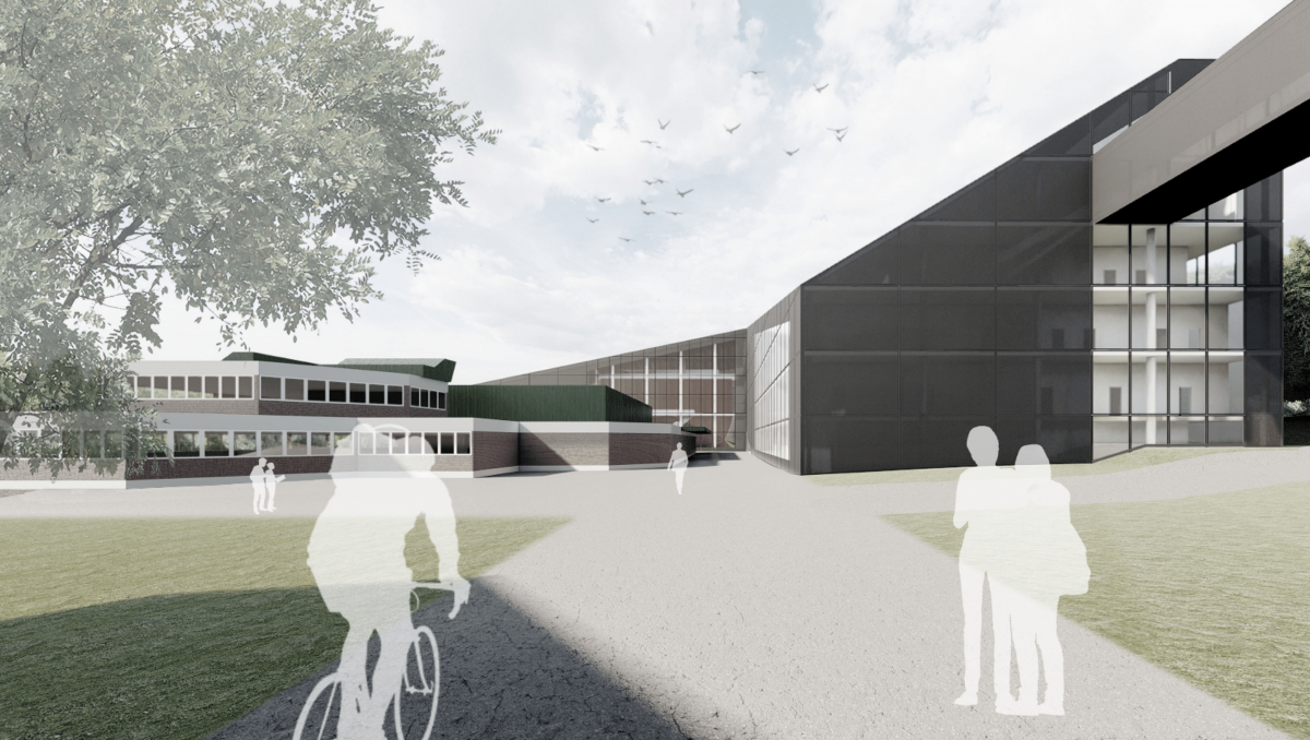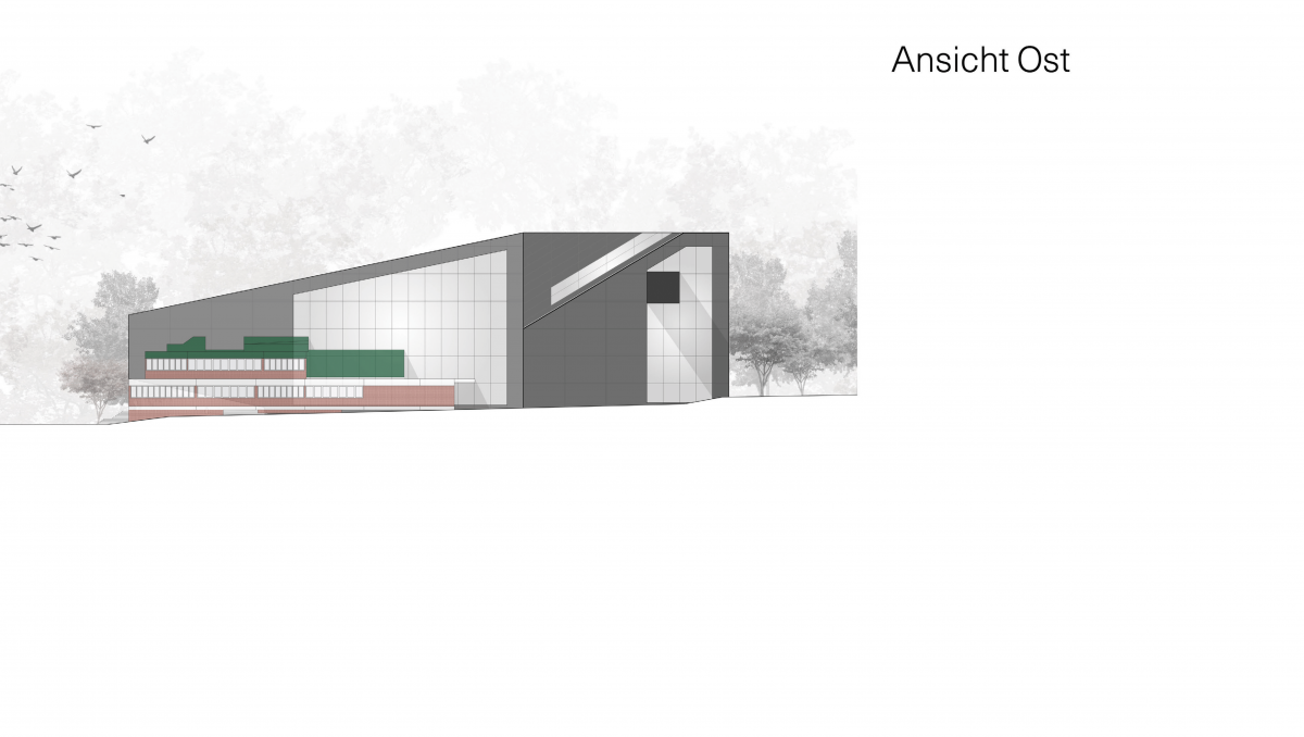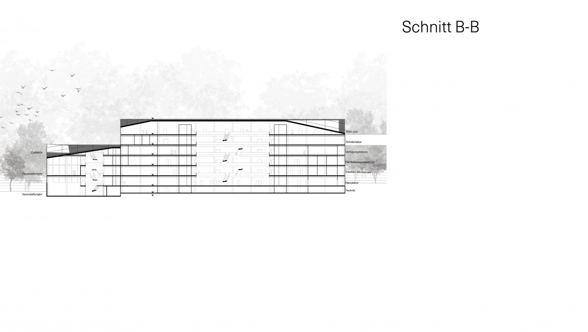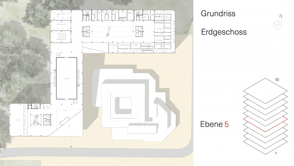 So eröffnen die freien Treppenräume vielfältige Wege und Begegnungsstellen. Eine Besonderheit des Entwurfes ist das kupferfarbene „Haus-im-Haus“, das einen Verbindungspunkt in dem Z-förmigen Gebäude schafft und zugleich einen großzügigen Ausstellungsbereich bietet, auf dessen Dach sich die Cafeteria mit Galeriebereich und freiem Blick nach unten befindet.