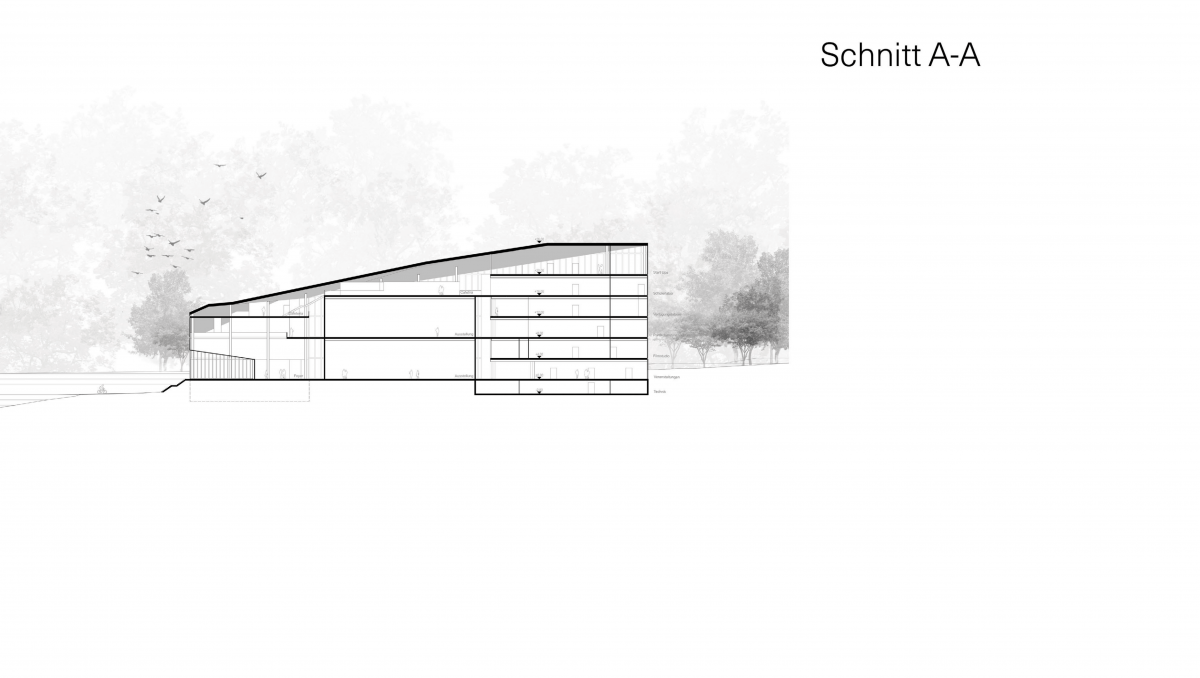 Ausgangspunkt von Alexandra Bläsi, Melina Enzmann und Christian Witt ist die Dachlandschaft der Universität Konstanz. Entsprechende polygonale Dachlandschaften bestimmen auch in ihrem Entwurf die eindrucksvolle Außenstruktur des Forumsgebäudes. Die verwinkelten, spitz zulaufenden Formen machen im Inneren einem geordneten, regelmäßigen Aufbau der Etagen Platz. Ein weiteres zentrales Element des Entwurfes ist das Platzieren und Herausnehmen von „Raum-im-Raum“.