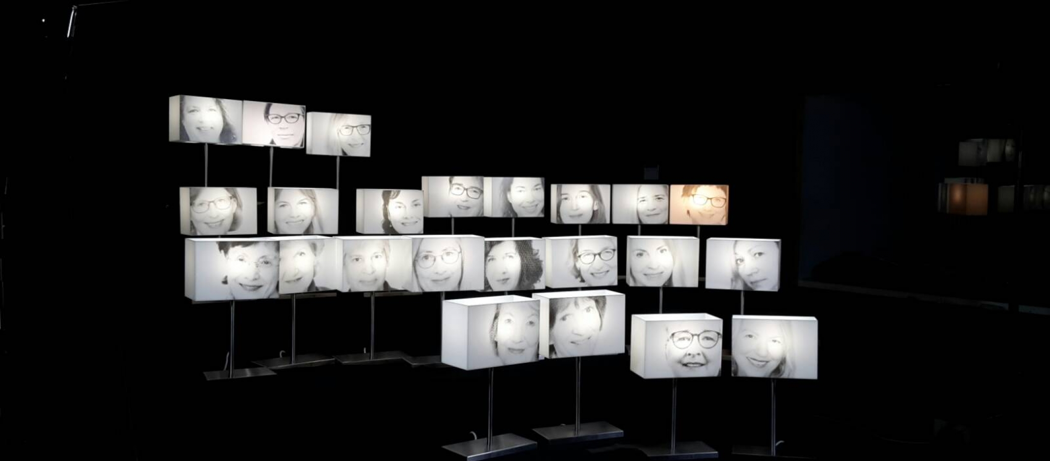 Information zum Headerbild: Frauen, die in den vergangenen 30 Jahren das Amt der Frauen- und Gleichstellungsbeauftragten und der Prorektorinnen für Gleichstellung übernommen haben – inklusive Marion Woelki als Frauen- bzw. Gleichstellungsreferentin – wurden von Rektorin Katharina Holzinger für ihr Engagement mit einem leuchtenden Kunstwerk geehrt. Es ist mit dem jeweiligen Porträt bedruckt.