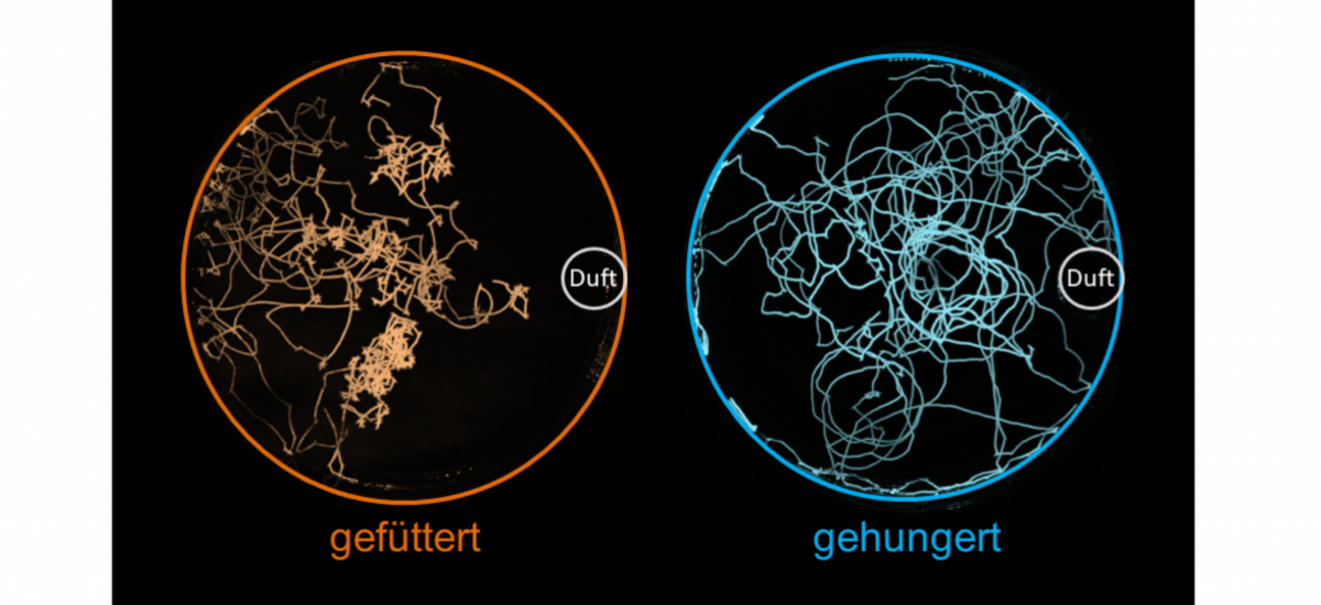Mithilfe von klassischen Verhaltensversuchen zeigte Katrin Vogt zunächst, dass hungrige Fliegenlarven bestimmte pflanzliche Geruchsstoffe anziehend finden, zu denen satte Larven lieber Abstand halten. Genau wie bei uns Menschen beim Einkaufen steuert hier also der Zustand des Hungers, ob bestimmte Nahrungsquellen angenommen oder abgelehnt werden. „Da das Fressen für Fliegenlarven vor der Verpuppung essenziell ist, ziehen hungrige Larven auch solche Nahrungsquellen in Betracht, die für eine satte Larve nicht interessant genug wären“, erläutert Katrin Vogt.
