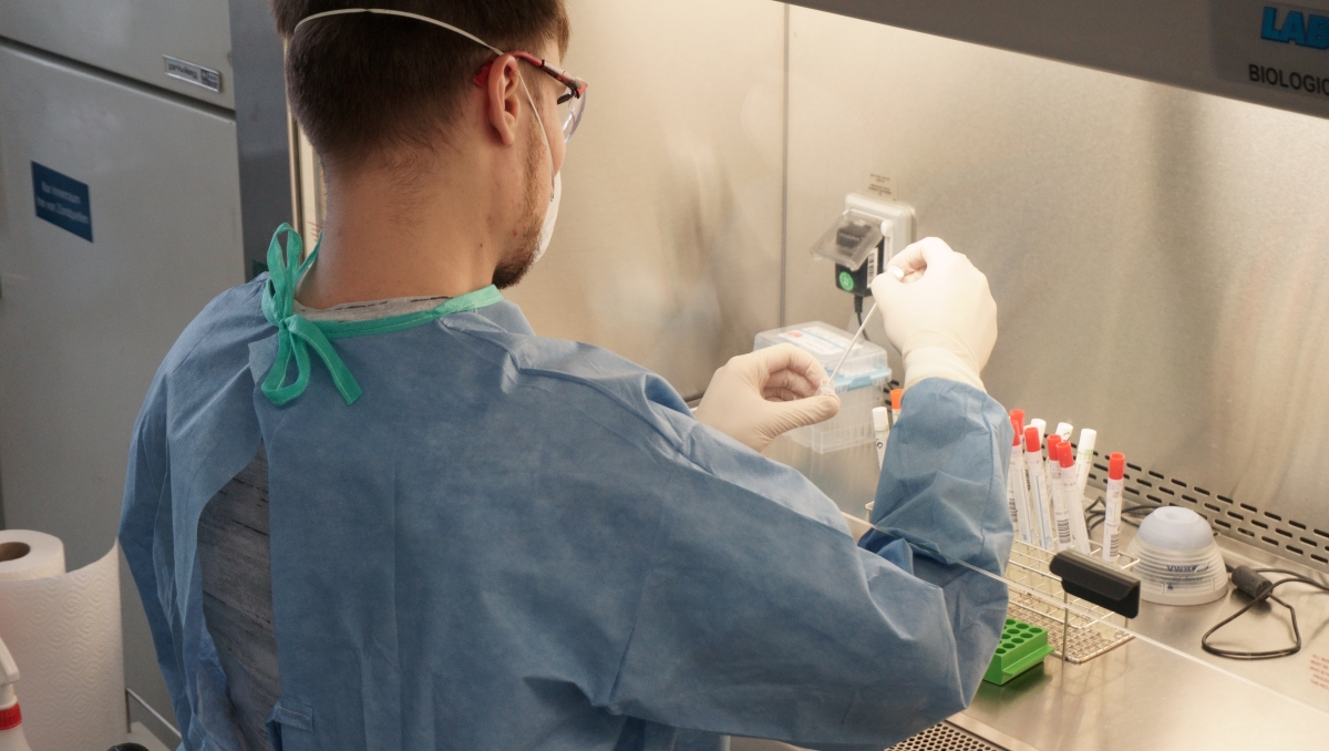 Bei dem Schritt, den das Universitätslabor aktuell übernimmt, handelt es sich um die sogenannte RNA-Aufbereitung. Hierbei wird zunächst der Erreger auf eine Weise inaktiviert, die dem Virus die Fähigkeit zur Infektion nimmt, aber das Erbgut des Erregers für den diagnostischen Nachweis intakt lässt.